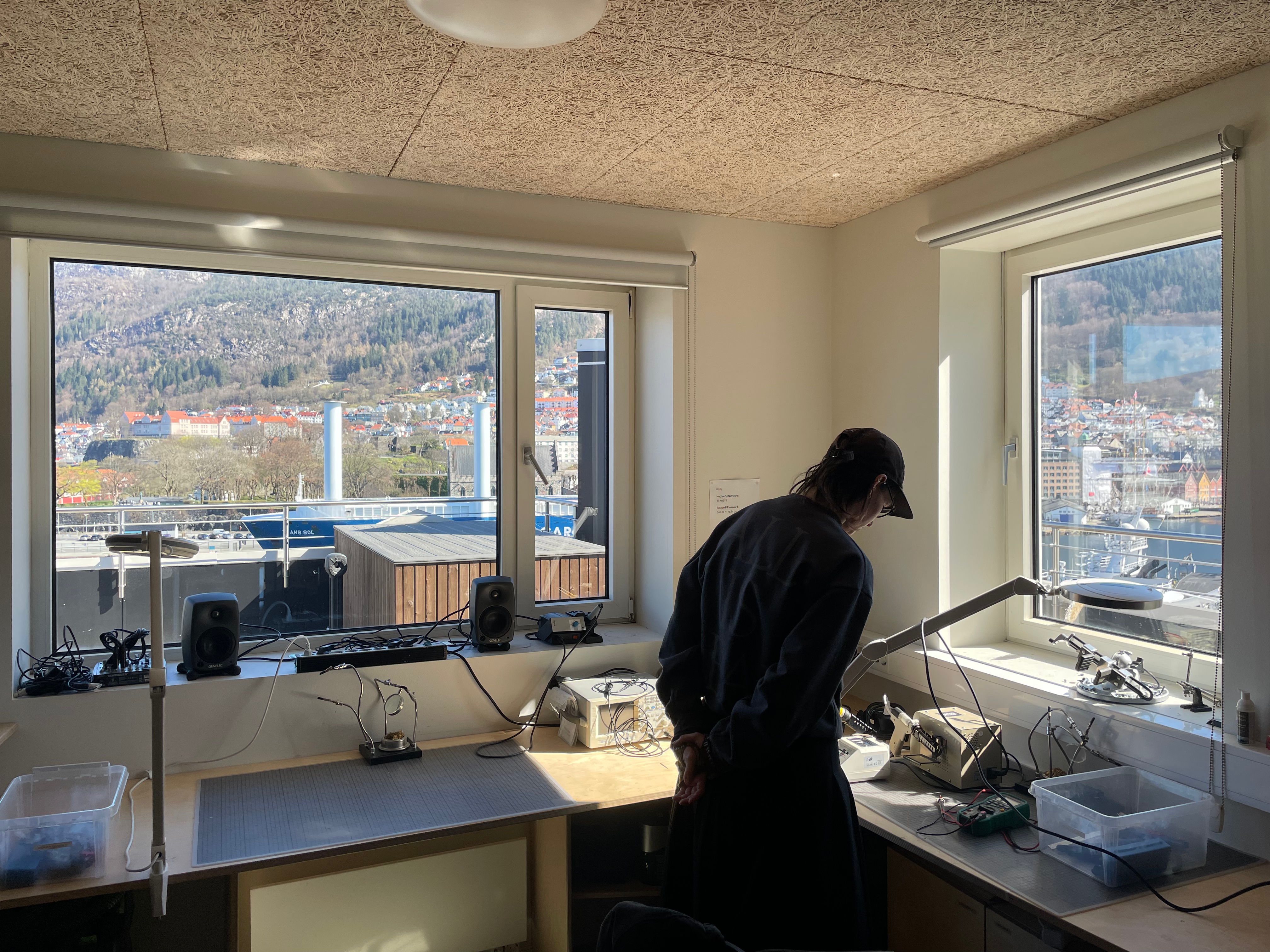 hello. It is Wednesday lunchtime and I am sat in BEK’s electronics studio looking out over the port and across to Sandviksfjellet, one of the seven mountains surrounding Bergen. Sam is sat behind me working on a poster for the next Petrichor gig. I feel slightly odd writing you because I know I’m going to post this blog post on instagram and tag BEK, which means people will see it, which is altering the way I write. Also I normally write you about things that have happened within the past few hours, but each day since we arrived I have been too tired to write you, leaving me with the task of remembering and reconstructing. Something I am not very skilled at.
